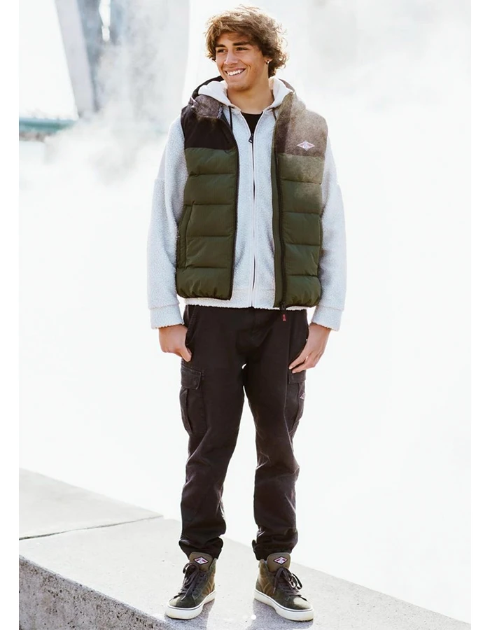 Sleeveless down jacket with hood. Logo patch applied on the front.