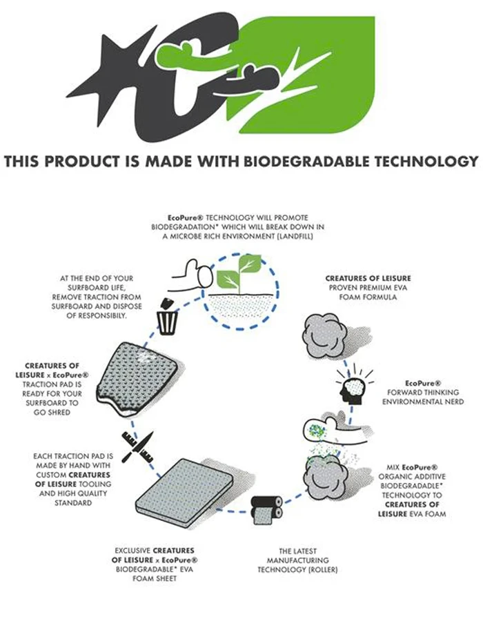 We want to reduce the impact our designs have on the environment. That’s why Creatures teamed up with Bio-Tec Environmental to deliver traction that offers lasting EVA performance, which breaks down in landfill at the end of your board’s life. Always packed in recyclable, biodegradable materials.