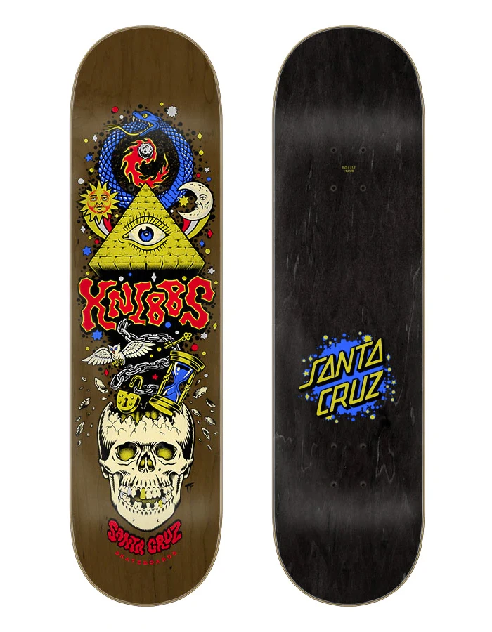 Santa Cruz Skateboards Jereme Knibbs Alchemist pro deck featuring art by Thomas Fernandez @liveradstudios with spot gloss graphic print on 7 ply North American Maple pressed individually using epoxy making a strong, responsive deck with long lasting pop and consistent concave and kick.