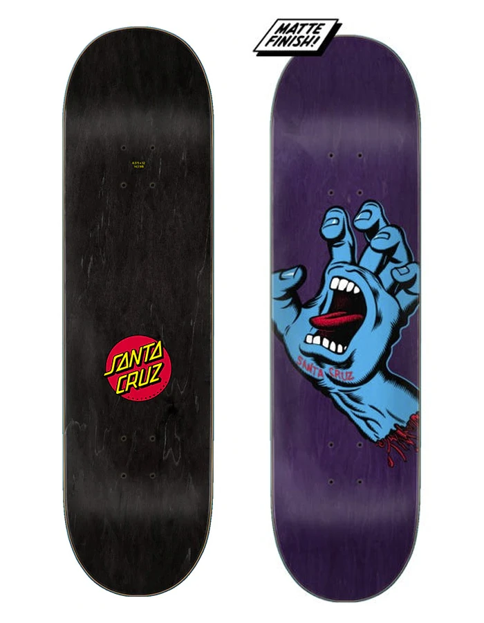 Santa Cruz Skateboards Screaming Hand graphic deck on 7 ply North American Maple pressed individually using epoxy making a strong, responsive deck with long lasting pop and consistent concave and kick, topped off with our signature matte finish.