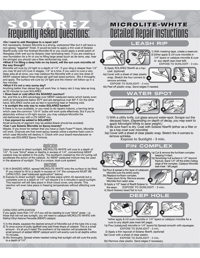 Formulated especially for surfboard [urethane] foam repair. For deep dings. Lightweight and easy to sand. Cures either by UV light in approx 3 minutes or by MEKP catalyst in 30 minutes.