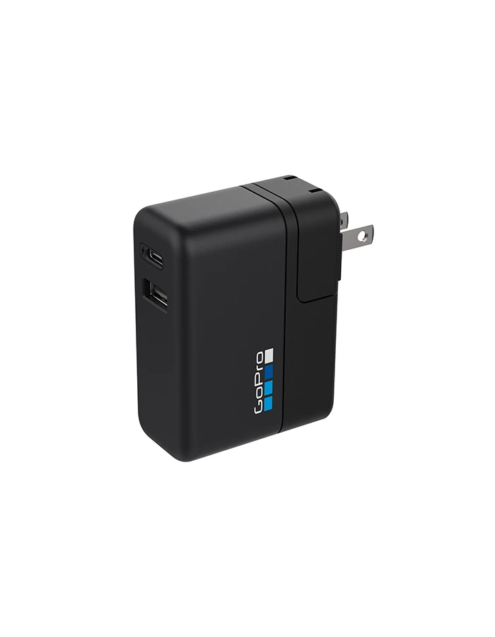 The fastest way to charge your GoPro, the 27.5W Supercharger (International Dual-Port Charger) lets you charge two GoPro devices simultaneously—anywhere in the world. The USB-C port offers 20 to 70% faster charging on fast-charge compatible devices1 compared to using a conventional charger.2